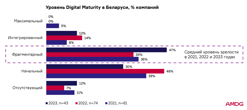 Компания AMDG провела ежегодное исследование для оценки цифровой зрелости белорусского бизнеса. В опросе Digital Maturity, который проводился с ноября 2023 по январь 2024 года, приняли участие 43 компании. По результатам исследования общий уровень digital-зрелости белорусского бизнеса находится на фрагментарной ступени.
