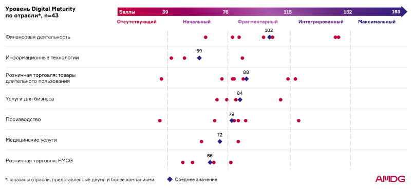 Максимальным уровнем Digital Maturity обладают компании, работающие в отраслях финансовой деятельности и розничной торговли товарами длительного пользования. Средние показатели цифровой зрелости этих организаций относятся к фрагментарному уровню. На этой же ступени находятся компании, оказывающие услуги для бизнеса, и предприятия производственного сектора.