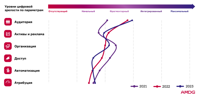 Опрос показал, что наибольший рост показателя Digital Maturity произошел по атрибутам «Аудитория” и «Организация” (+3% в показателе). По параметру «Организация» в 2023 году рынок перешел с начальной на фрагментарную ступень digital-зрелости.