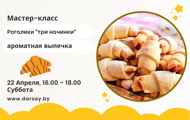 В субботу 22 апреля приглашаются детки от 5 лет на кулинарный мастер-класс, где они будут печь ароматные и воздушные рогалики с тремя разными начинками. Хороший повод позвать семью и друзей на вечерний чай и отведать рогалики собственного приготовления.