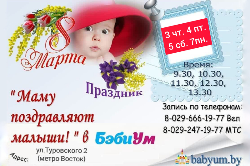 В канун одного из самых красивых, нежных праздников весны, Детский интеллектуальный клуб «БэбиУм» приглашает Вас отдохнуть от забот и посетить вместе с ребенком мероприятие «Маму поздравляют малыши».