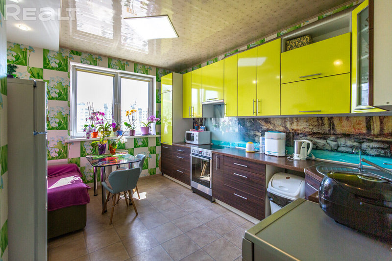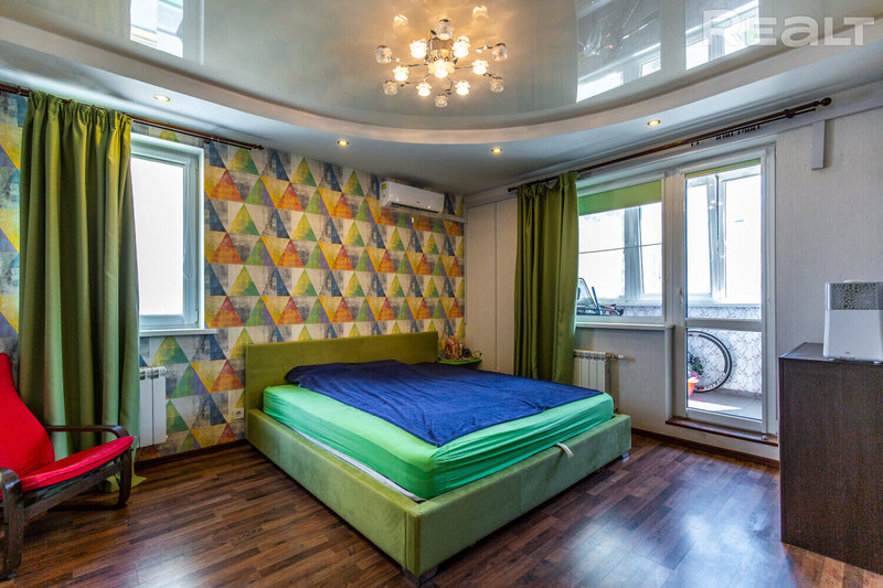 В доме действует уникальная система рекуперации – это обогрев холодного приточного воздуха посредством теплопередачи удаляемого теплого воздуха. В доме работает консьерж, что является дополнительным элементом системы безопасности. Напротив строится огромный ТЦ с катком и батутной ареной – чем не преимущество. А что внутри? Яркая большая кухня на 13 «квадратов», спальня и детская в жизнерадостных тонах, застекленная лоджия и зона прихожей с фактурой «под дерево».