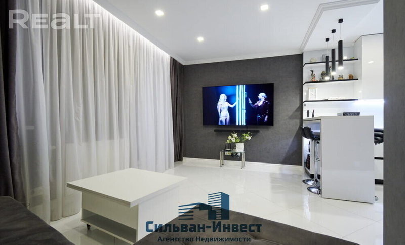«Квартира полностью готова для комфортного проживания: выполнена полная звукоизоляция, имеется видеонаблюдение, теплые полы, французские натяжные потолки с хрустальными люстрами, бра – единая эксклюзивная коллекция из Италии. Электрический камин с инсталляцией и звуковыми эффектами». Общая площадь квартиры 78 «квадратов», из которых 44 – жилые. Будущих жильцов приглашают на просмотр и пишут, что торг уместен.