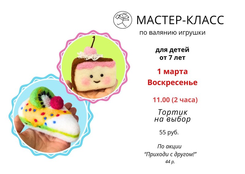 Мастер-класс для детей по валянию игрушки из овечьей шерсти - аппетитный тортик на выбор! У нас белая и шоколадная глазурь – у вас может быть любая на ваш вкус, цвет шерсти можно выбрать.