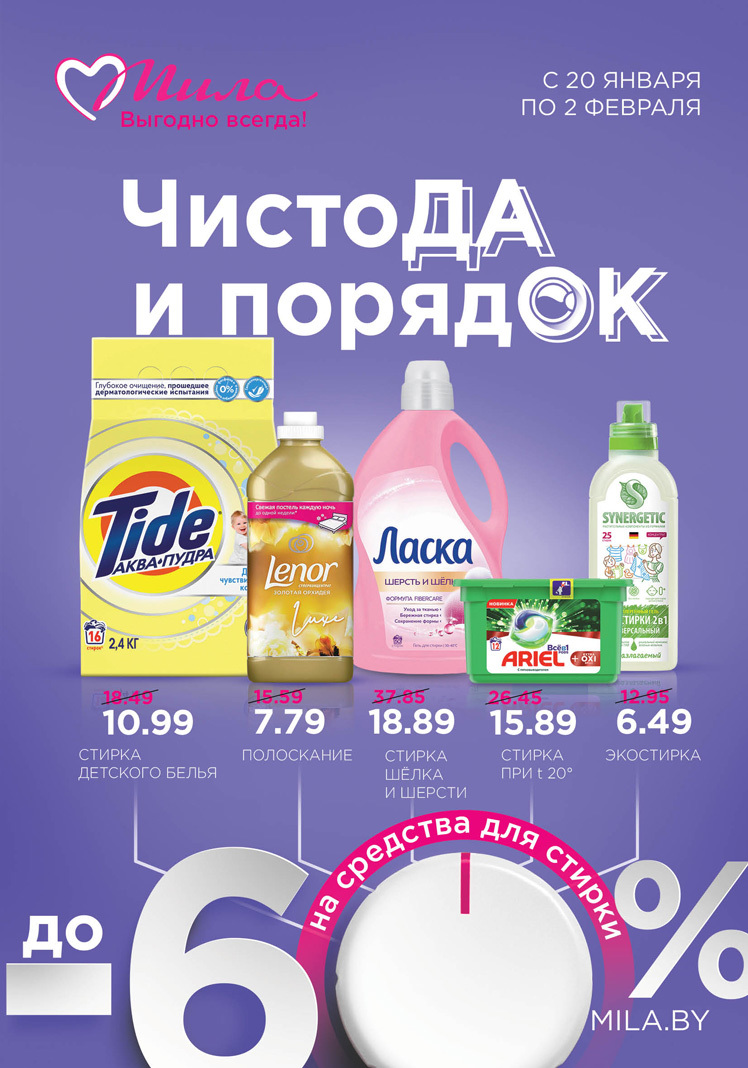 С 20 января по 2 февраля в сети магазинов Мила скидки до 60% на товары для стирки и уборки в доме. Заказывайте с доставкой на сайте! А все акционные предложения в «Миле» можно посмотреть здесь.