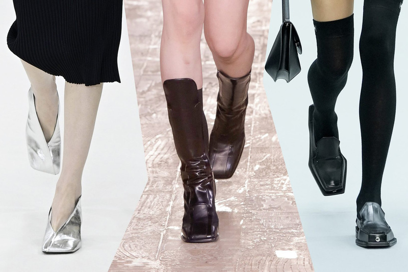 Каблук с острым кончиком раньше был изюминкой Balenciaga, но теперь каждый бренд дополнил что-то свое в замысловатый «угловой» каблук. Теперь это и геометрические танкетки, и даже туфли-мюли на платформе.