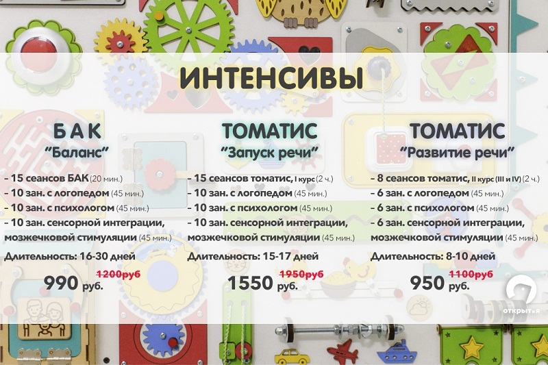 Всестороннее воздействие на ребёнка, состоящее из акустической, дефектологической и двигательной нагрузок - это достаточно эффективный инструмент в вопросе запуска, развития и стимуляции речи. Поэтому «ОТКРЫТиЯ» разработали несколько программ – «интенсивов». Акустический вид стимуляции, на основе которой будет состоять интенсив, как правило, рекомендует личный доктор (невролог, логопед). Также мы проводим бесплатную консультацию по акустическим стимуляциям и даём свои рекомендации по эффективности той или иной акустики.
