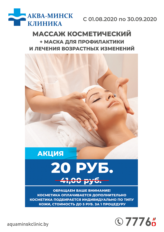 До 30 сентября включительно в медицинском центре «Аква-Минск Клиника» скидка на комплекс услуг косметический массаж лица + маска для лечения возрастных изменений кожи.