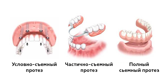 Съемное протезирование. Отличительной особенностью съемного протеза является то, что пациент может самостоятельно снять и надеть его обратно. Съемные зубные протезы устанавливаются на собственные зубы или непосредственно крепятся к деснам. Широкое применение таких протезов обусловлено их низкой стоимостью. Кроме того, это единственный выход для пациентов, имеющих противопоказания к проведению дентальной имплантации. К съемному протезированию относятся протезы с креплением на импланты, бюгельные протезы, пластинчатые протезы, гибкие протезы.