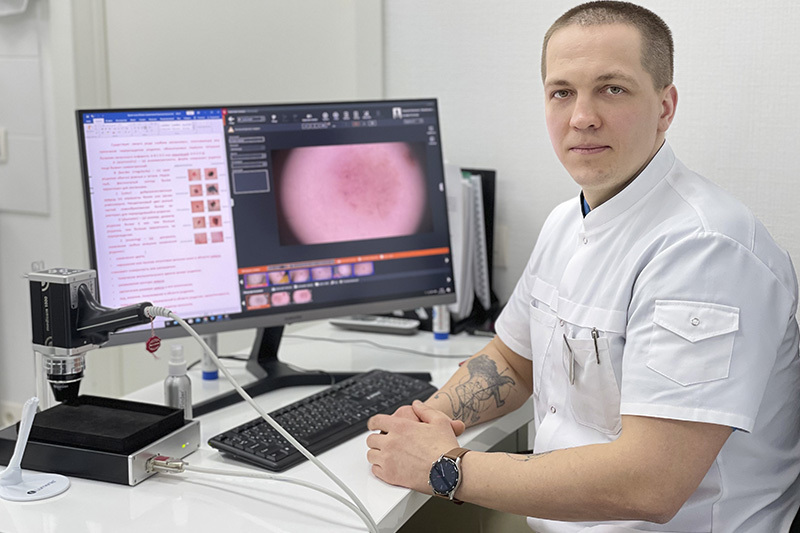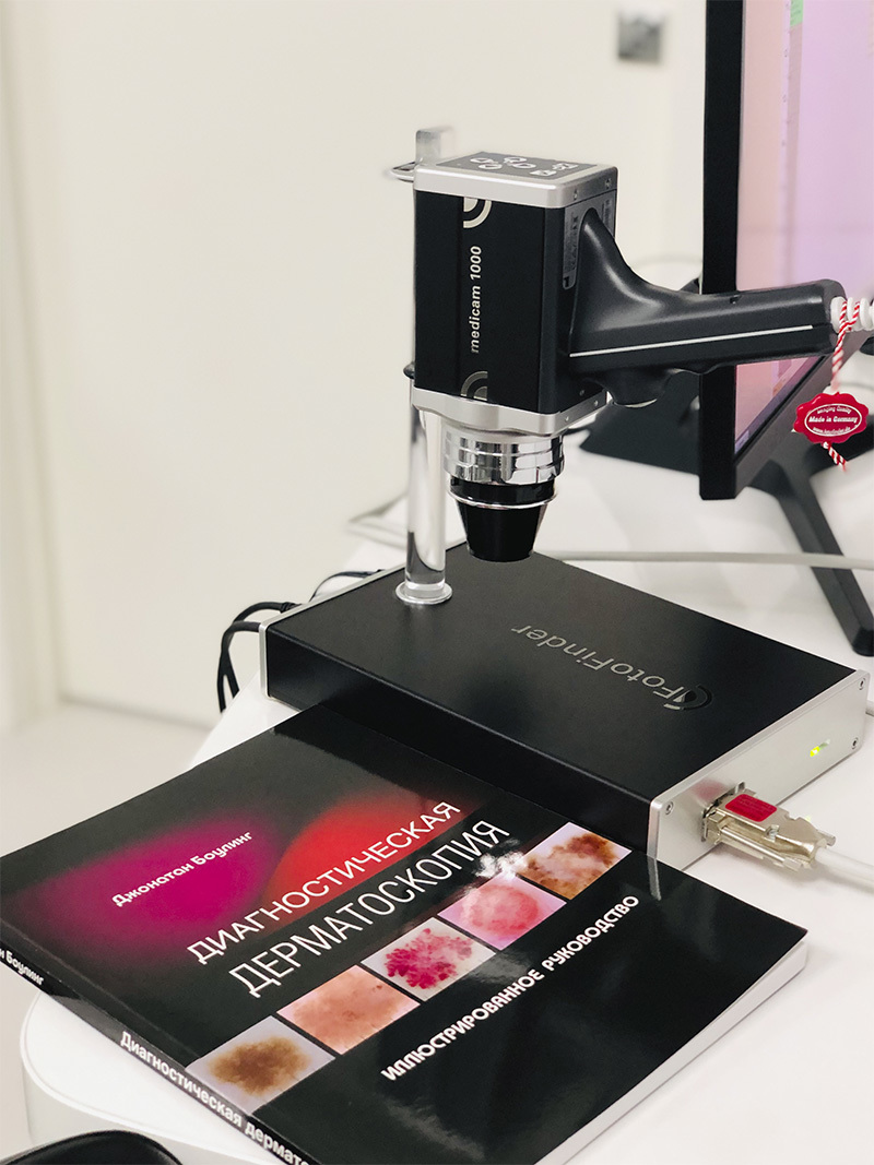 Это самый современный аппаратный диагностический метод, позволяющий произвести визуальную оценку патологически измененных кожных очагов с помощью дерматоскопа. Цифровые снимки новообразований с большим увеличением при интенсивном поляризованном освещении позволяет анализировать внутрикожные структуры даже на уровне эпидермиса и дермы, и выявлять меланомы на самых ранних стадиях.