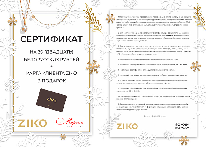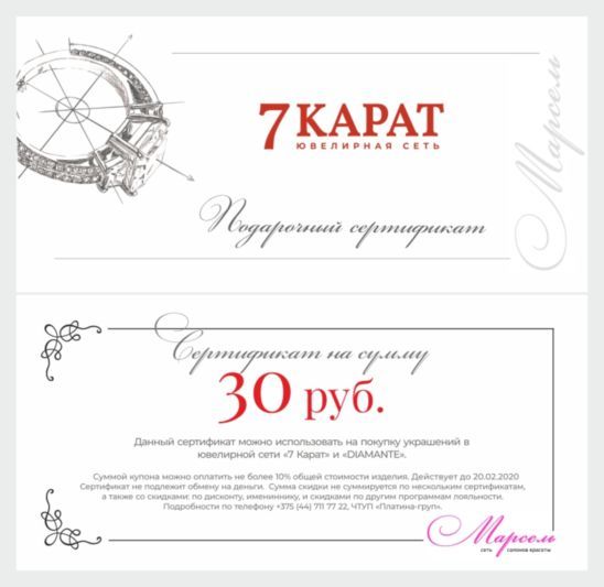 7 карат - сертификат на сумму 30 рублей на продукцию ювелирной сети