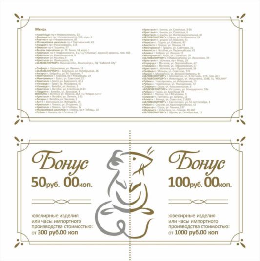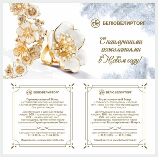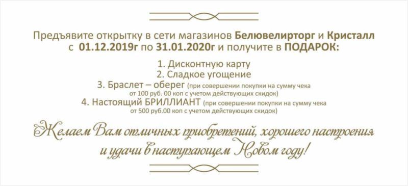 Белювелирторг - дисконтную карту ювелирной сети, сладкое угощение, браслет - оберег и настоящий бриллиант, а также бонус на 50 и 100 рублей на ювелирные изделия или часы импортного производства