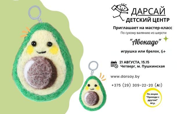 Приглашаем в творческую студию «Дарсай» детей от 6 лет на мастер-класс по валянию игрушки-брелока из шерсти. С ребятами сваляем весёлого авокадика. Он мечтает стать героем ваших приключений.