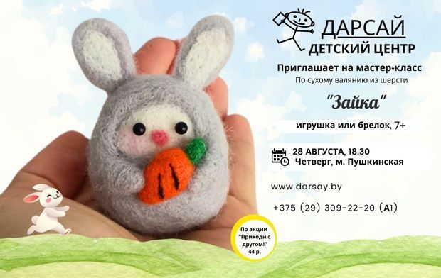 Приглашаем в творческую студию «Дарсай» детей от 7 лет на мастер-класс по валянию игрушки из шерсти. С ребятами сваляем пушистого серого зайку с ярко-оранжевой морковкой. Его серебристая серая шубка так и переливается на летнем солнышке.