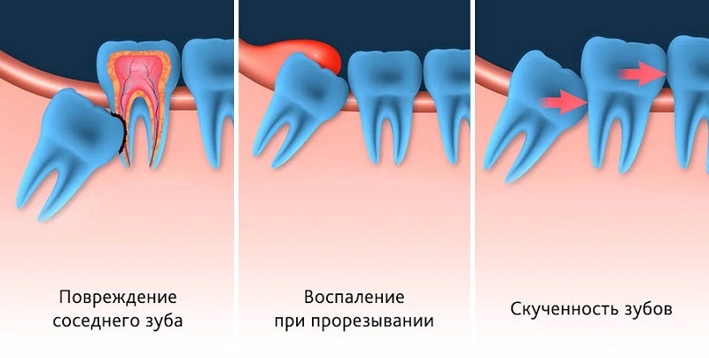 Зуб мудрости может расти как с одним из этих дефектов, так и сразу с двумя. Ретенция и дистопия, как правило, сопровождаются воспалением десны, отёком мягких тканей и другими малоприятными симптомами. Худший вариант развития событий — смещение зубного ряда и, как следствие, длительное и дорогостоящее лечение у ортодонта.
