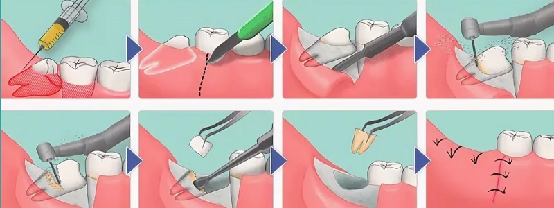 Если восьмёрка дистопирована, ретинирована или всё сразу, то быстро и просто избавиться от неё не получится. Для удаления проблемной восьмёрки врач может использовать скальпель, бормашину, лазер, элеватор и другие хирургические инструменты. Этапы операции: