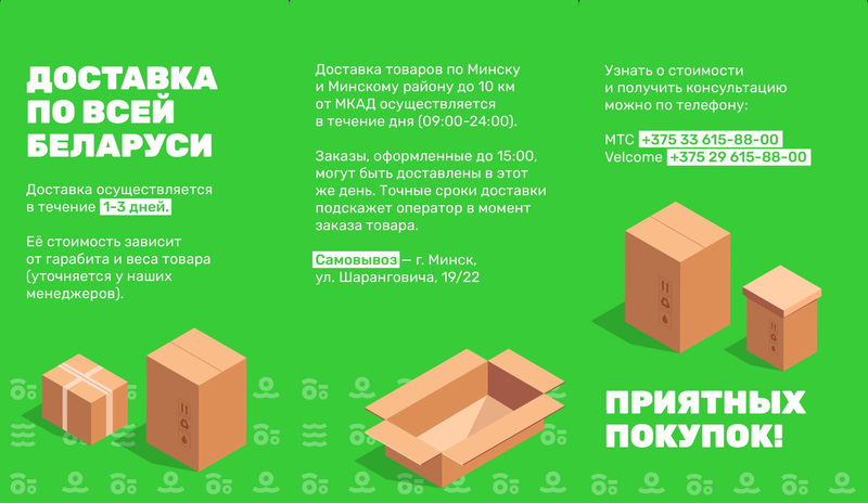 - Пункт выдачи товаров: г. Минск, ул. Шаранговича, 19/22