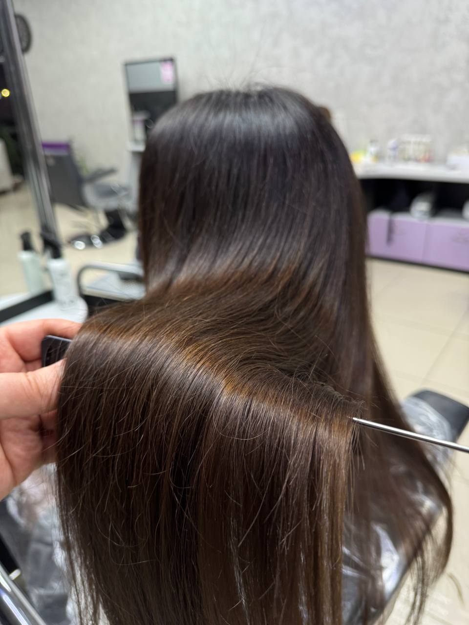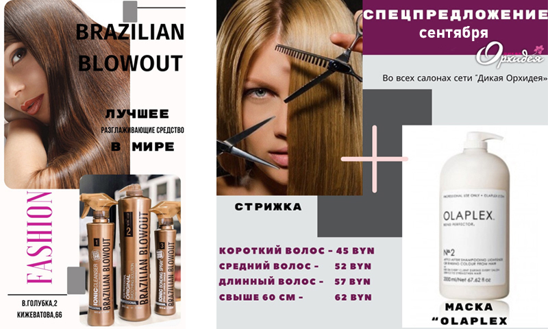 - Услуги для волос: биозавивка, выпрямление волос «Brazilian blowout», ламинирование, экранирование, пилинг кожи головы, восстановление волос «Олаплекс» , вечерние прически, укладки, макияж, калифорнийское мелирование, сложные техники окрашивания волос, модное тонирование, стрижка горячими ножницами.