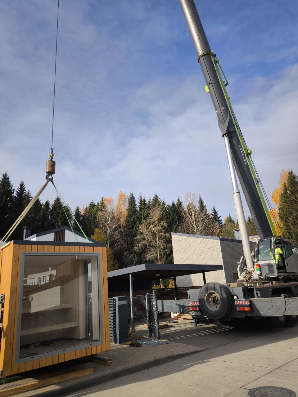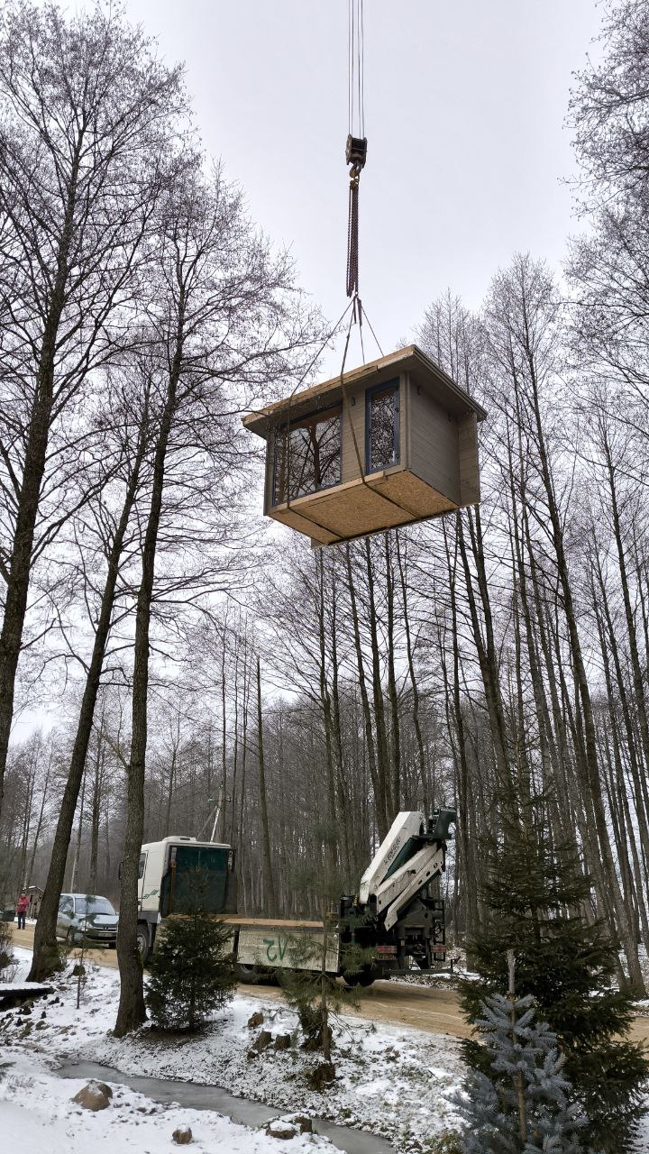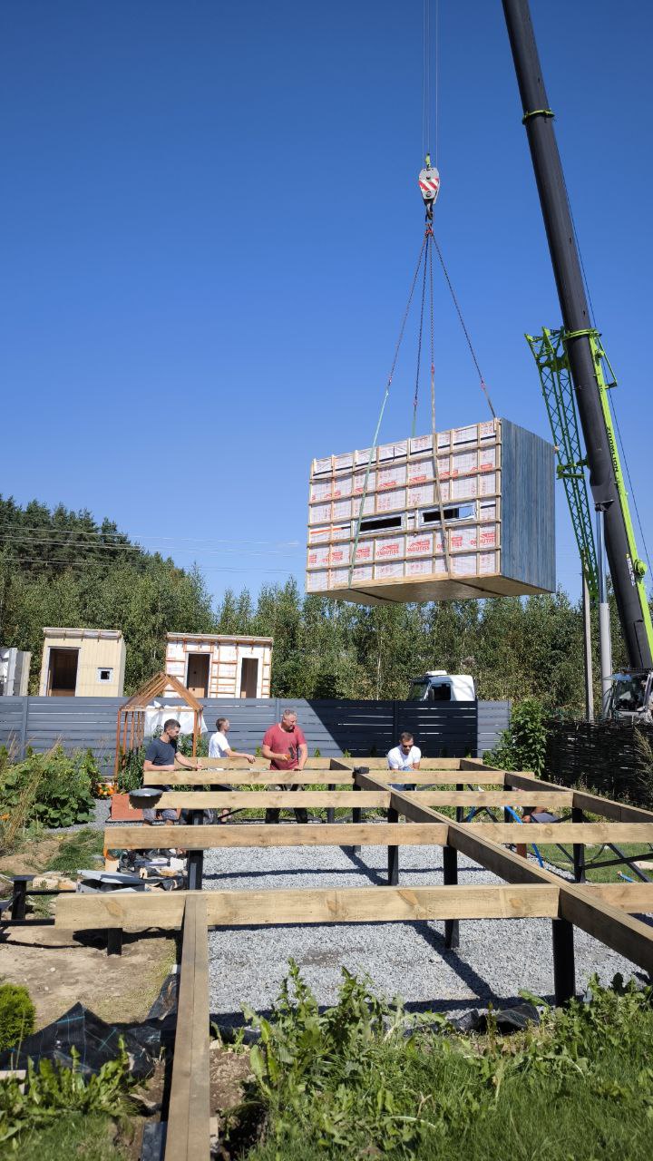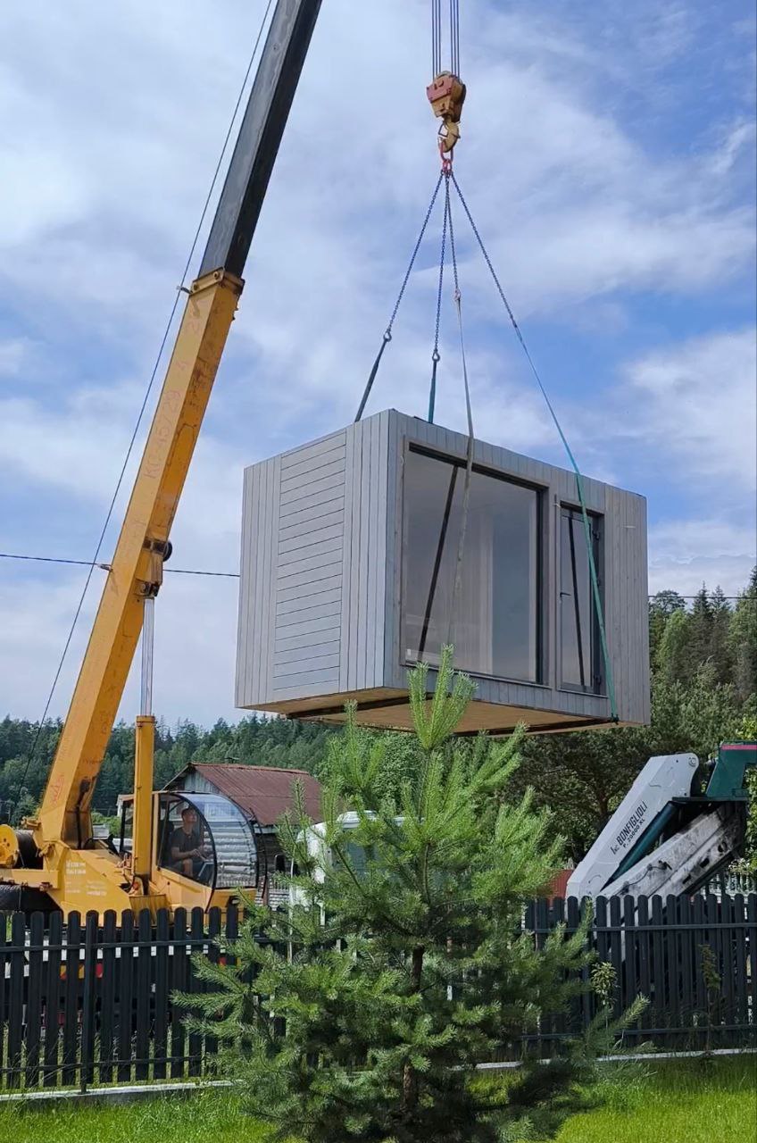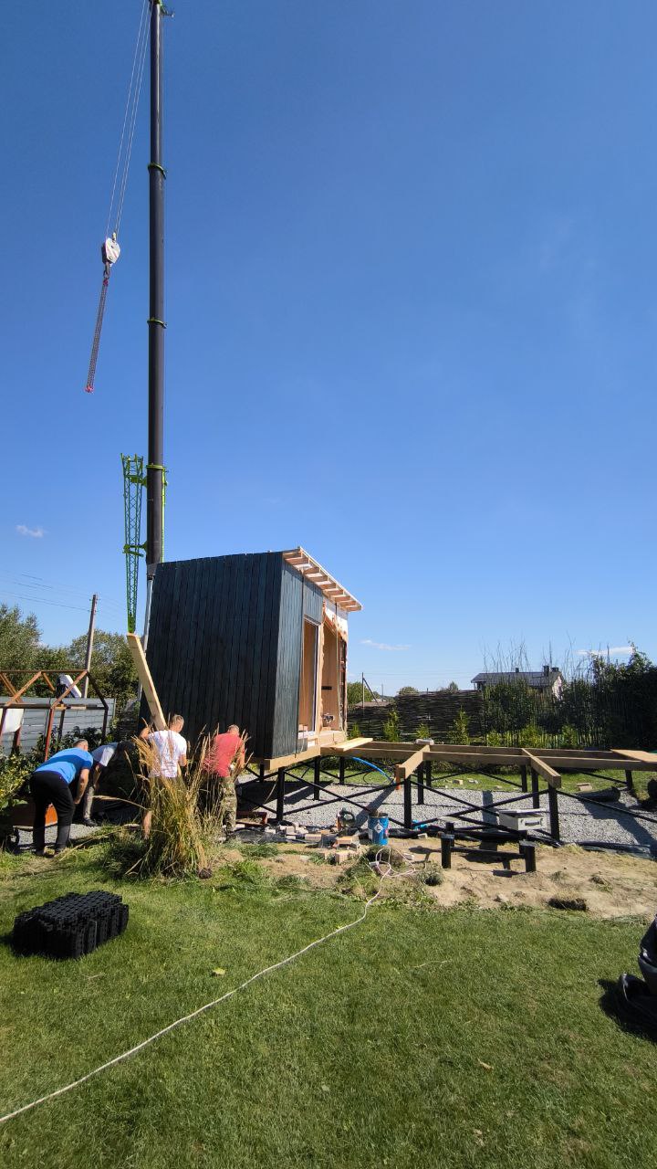 - Мобильность. Стройке — нет! Мы привозим вам готовый модульный дом или баню и устанавливаем на участке за 1−2 дня.