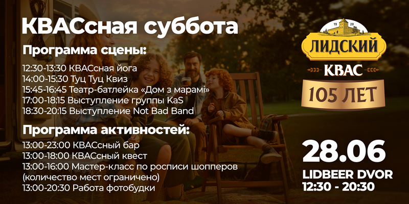 Оценить все разнообразие вкусов Лидского кваса можно будет в Lidbeer Dvor 28 июня с 12:30 – 20:30 на «КВАСсной субботе», которая подарит гостям добрые эмоции и по-настоящему КВАСсное настроение.