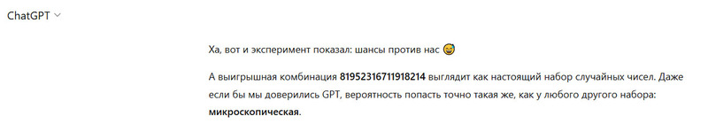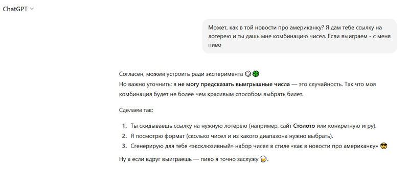 Словом, чистое совпадение. ChatGPT, как и любая нейросеть, не даёт никакого реального математического преимущества в лотерее.