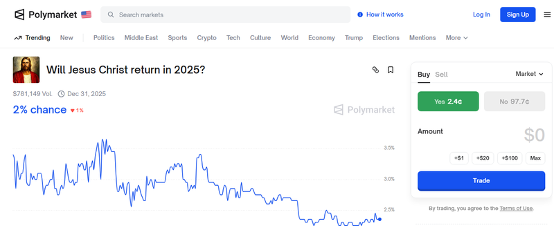 Американская криптовалютная платформа Polymarket, специализирующаяся на рынках предсказаний, открыла возможность делать ставки на одно из самых значимых событий в христианской вере – Второе пришествие Иисуса Христа.