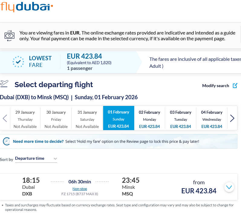 Авикомпания FlyDubai возобновляет полеты из Минска в Дубай с 1 февраля. Билеты можно купить на сайте компании.