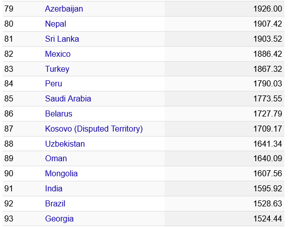Украина в рейтинге заняла 100 место, Россия — 74 место, Латвия — 59 место, Польша — 40 место, Литва — 33 место.