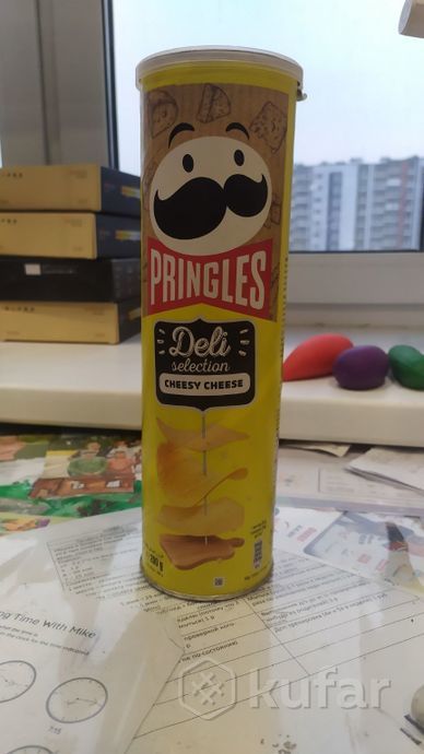Здесь «туба» желтого цвета с изображением картофеля на шпажке. Надпись Cheesy Cheese на упаковке говорит о том, что когда-то внутри лежали чипсы со вкусом сыра.