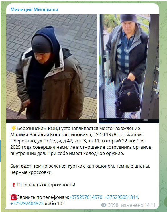 В Telegram УВД Миноблисполкома появилось объявление о розыске мужчины, напавшего на милиционера с ножом.