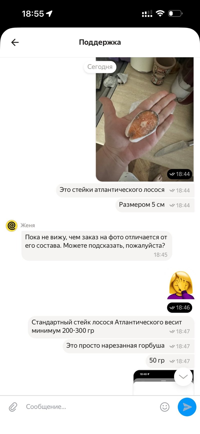 По словам девушки, она увидела акцию на стейк из лосося в рекламной листовке (39,99 рубля вместо 49,99 рубля) и решила заказать его через сервис «Яндекс. Еду». Открыв пакет с заказом, белоруска пришла в шок — стейк оказался крошечным: примерно 5-6 сантиметров в диаметре.