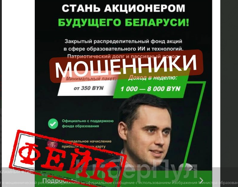 В тг-канале ведомства появился пост, в котором белорусам рассказали о мошеннической рекламе, выдаваемой за официальное сообщение с использованием изображения Министра образования Беларуси. Как считают в ведомстве, человек на фото мало похож на их руководителя Андрея Иванца.