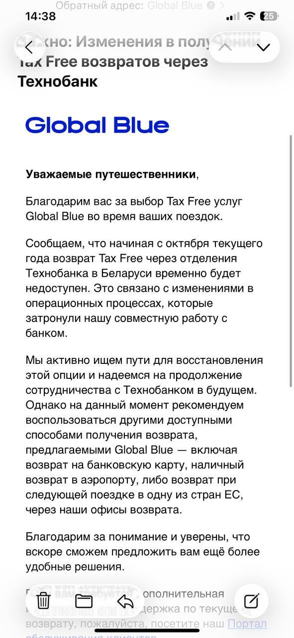 «Уважаемые клиенты! ОАО «Технобанк» с 22 сентября 2025 приостанавливает выплаты денежных средств по чекам Tax Free компании GLOBAL REFUND HOLDINGS AB».