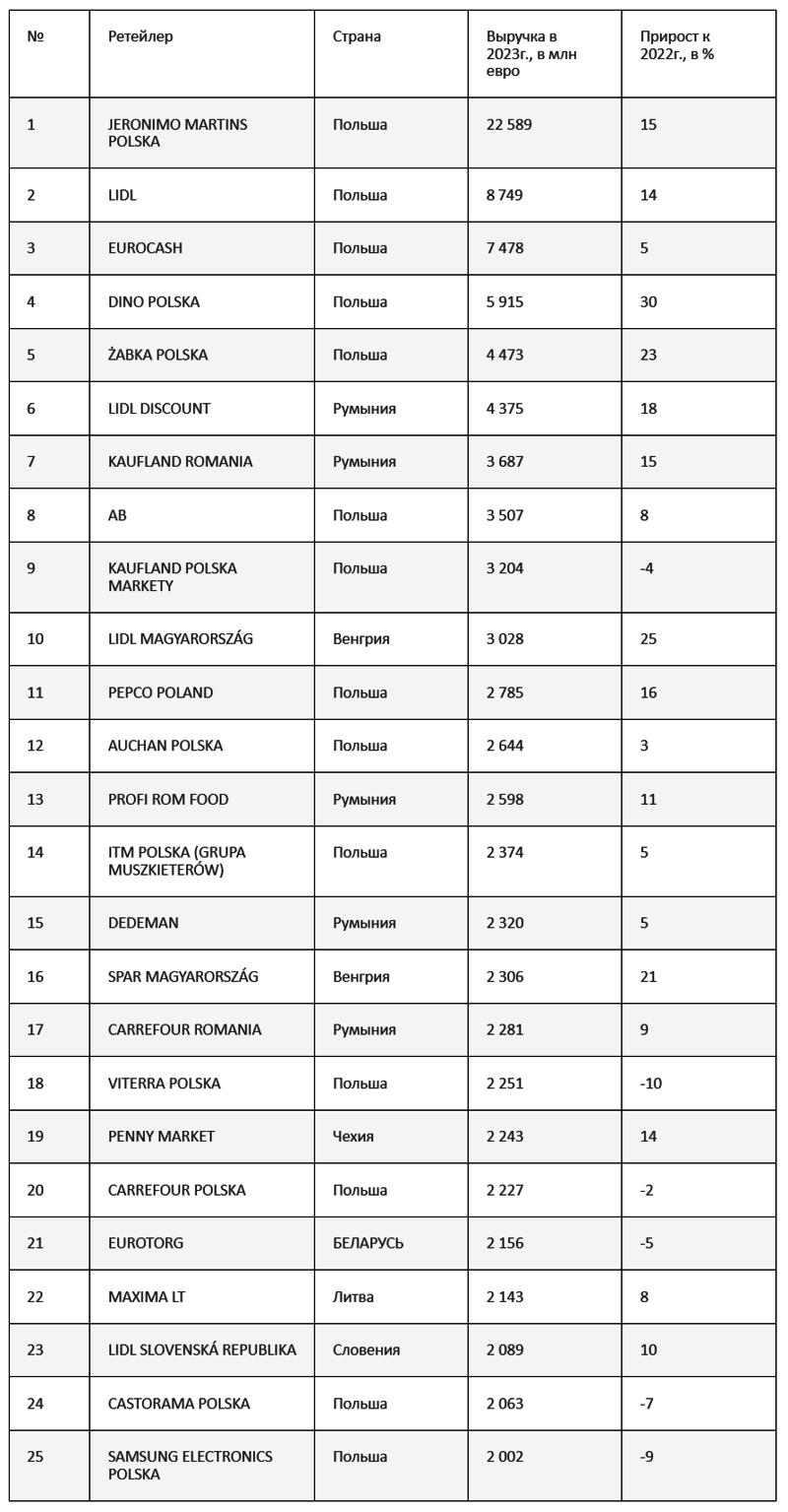 Топ-25 крупнейших ретейлеров Центральной и Восточной Европы и Беларуси в 2023 году выглядит так: