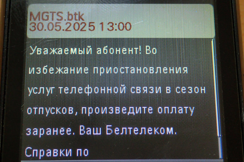 Выглядит слегка забавным, что о необходимости оплатить стационарный телефон говорят сообщением на мобильный. Впрочем, робот-автоответчик «Белтелекома» регулярно обзванивает и сами стационарные телефоны с просьбой оплатить услуги связи, причем очень часто делает это даже после того, как связь давно оплачена. Оператору надо бы обратить внимание на эту проблему.