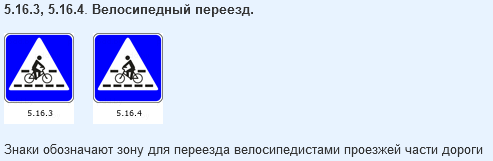 Также велопереезд обозначается дорожным знаком пешеходного перехода с дополнительно нанесенным изображением велосипедиста, вот таким: