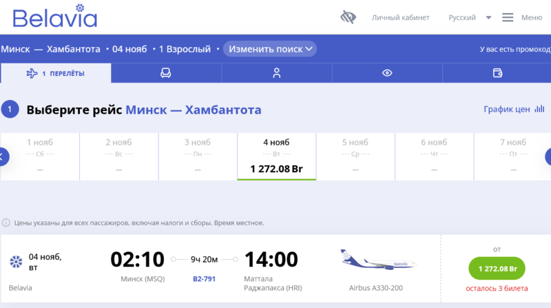 «Белавиа» отмечает, что для покупки билетов надо в выпадающем списке пунктов назначений выбрать либо Хамбантота (ближайший крупный город к аэропорту Маттала Раджапакса), либо Коломбо.