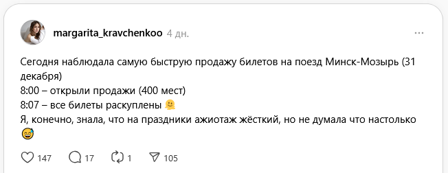 Пользовательница соцсети Threads пожаловалась, что билеты на поезд из Минска в Мозырь на 31 декабря раскупили за мгновение.