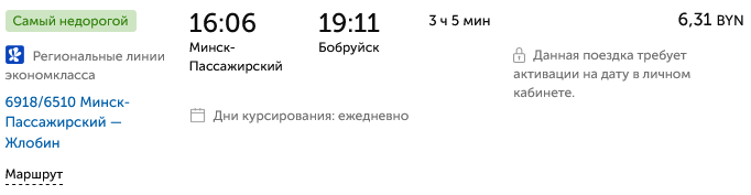 Некоторые пассажиры купили билеты на этот поезд не для того, чтобы добраться до конечной точки — Мозыря, — а до более ближних городов: Пуховичей, Осиповичей, Бобруйска, Жлобина. Поэтому на весь путь Минск — Мозырь билетов больше нет, зато есть на участки Жлобин — Мозырь и Бобруйск — Мозырь.