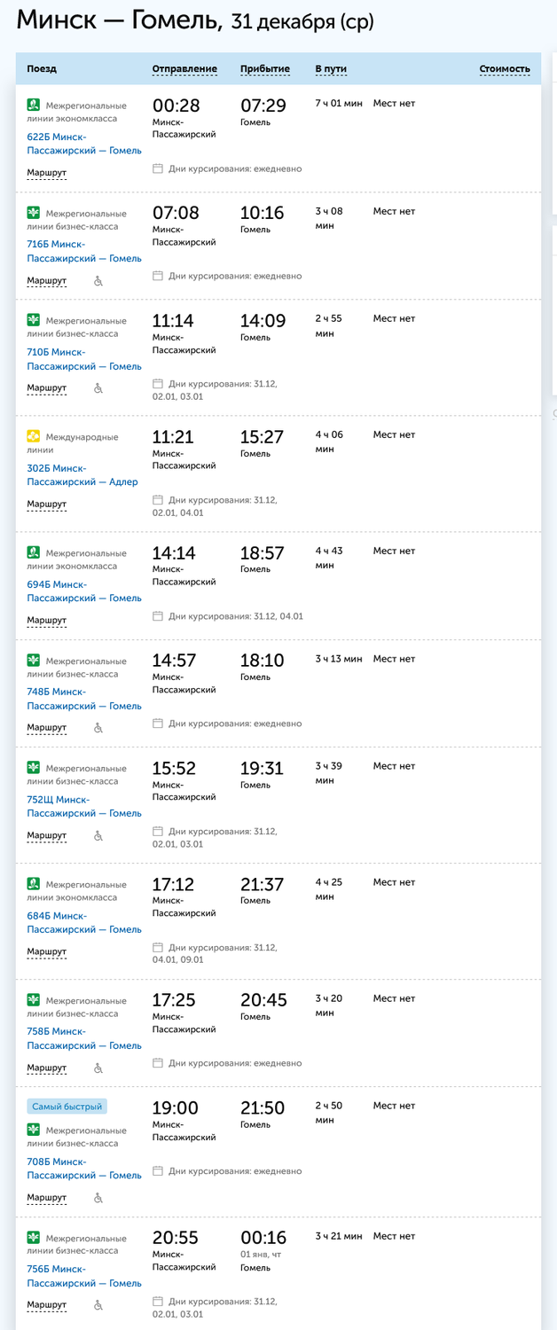 Еще можно было бы поехать в объезд через Гомель, но, во-первых, это намного дольше, а во-вторых, на 31 декабря билетов до Гомеля ни в один из 11 поездов тоже не осталось.