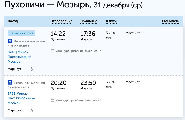 Blizko.by проверил: действительно, на 31 декабря на оба поезда Минск - Мозырь билетов больше нет. До Калинковичей (в 10 км от Мозыря) тоже нет. Как же уехать в Мозырь? Мы знаем секрет.