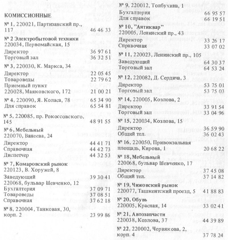Комиссионные магазины были очень популярны в советское время, когда многие горожане покупали себе там одежду, обувь, предметы интерьера по ценам ниже магазинных. Секонд-хендов в привычном понимании тогда еще не было, а ненужные вещи у населения — были. Наверняка ваши мамы-папы и дедушки-бабушки не раз и не два ходили по комиссионкам, стараясь найти себе и детям что-то получше и подешевле. Вот список комиссионных магазинов Минска из справочника 1988 года.