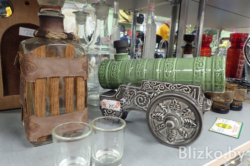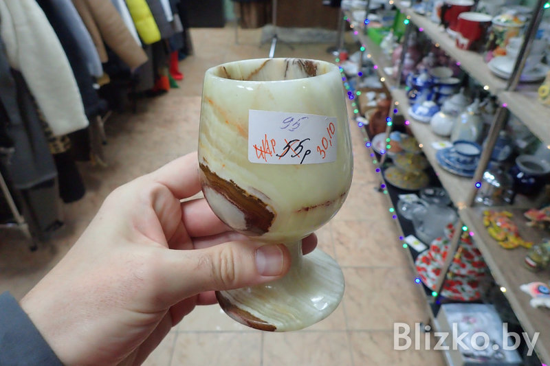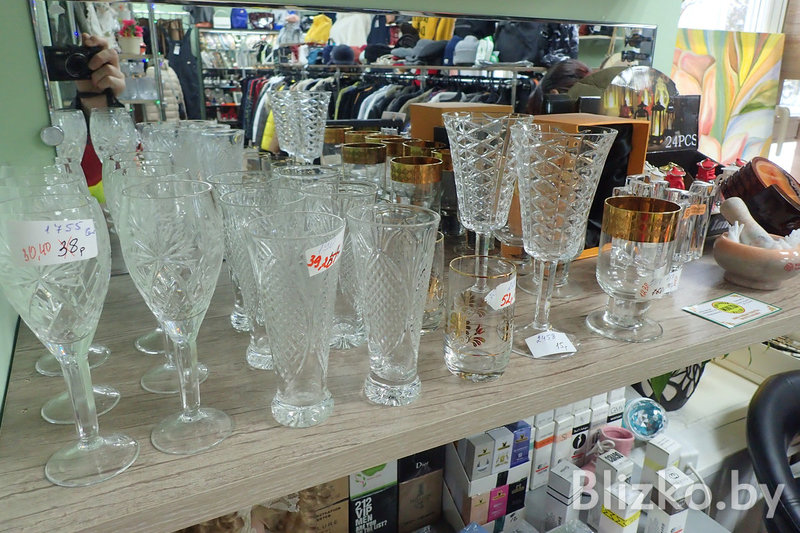 И даже целые «бабушкины сервизы», говорят нам, тут расходятся хорошо. И фарфоровые, и хрустальные наборы на много персон, и предметы из синего и зеленого стекла — на все есть спрос. И скатерть ручной работы купят, и ковер с бахромой, и брошку, и безделушку. Сувениры расходятся лучше, чем одежда, хотя одежды тут тоже полно, как и обуви. Среди них мы нашли женские туфли из коллекции Юдашкина за 8,40 рубля. Также очень неплохо разбирают женские сумки. Мы без особых трудов взяли и нашли сумки Gucci и Dolce&Gabbana. Или вот «рюмка», если можно ее так назвать, выточенная из какого-то ценного камня.