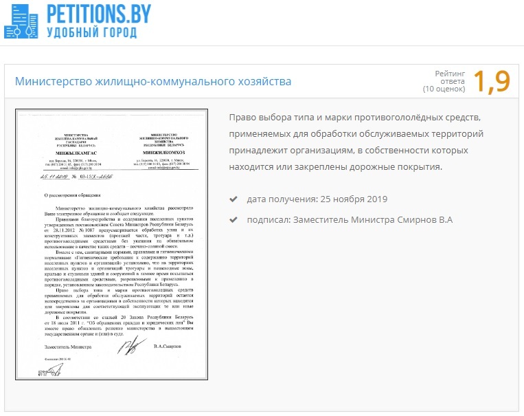 В тексте петиции автор подчеркнул все недостатки технической соли, используемой в столице. Были предложены и альтернативы. Например, как отмечал создатель петиции, в Финляндии для топления льда используют гранитную и каменную крошку, в Швеции – так называемый теплый песок, а в США – отходы ликеро-водочного производства. Петицию, которая набрала 269 подписей, отправили на рассмотрение в Министерство жилищно-коммунального хозяйства. Обращение рассмотрели и дали ответ за подписью замминистра. В письме-ответе отметили, что можно использовать только те противогололедные средства, которые предусмотрены санитарными нормами и правилами, а порядок их применения установлен законодательством.