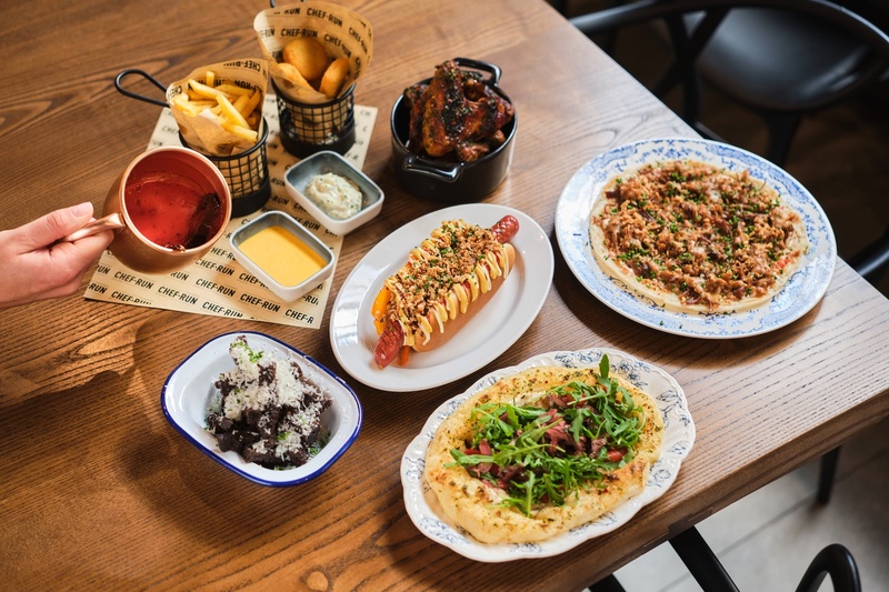 - Классический корн-дог с охотничьей колбаской, расплавленным сыром Чеддер и хрустящим беконом под горчичным соусом