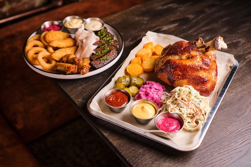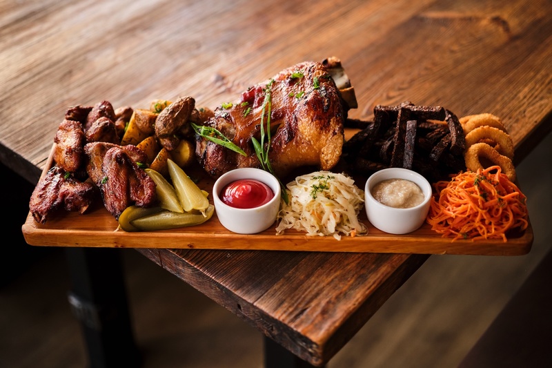 - Большая свиная рулька с салатом коул слоу и жареным картофелем, подается с маринованным луком, маринованными огурчиками, сладкой горчицей, соусом сальса и соусом гриль