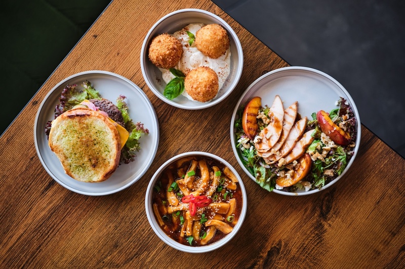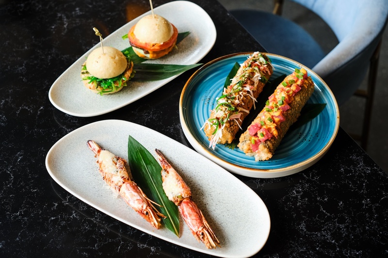 - Хрустящие аранчини из японского риса с ломтиками жареного бекона и сливочной моцареллой, подаются с кремом из копченой сметаны с трюфельным маслом