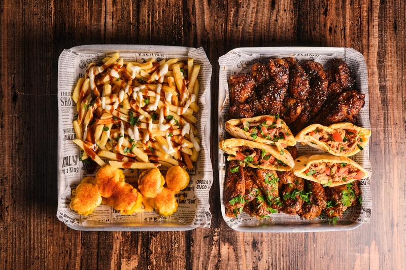 - Попкорн из курицы на картофельной подушке с соусом спайси