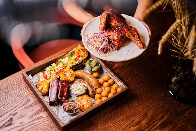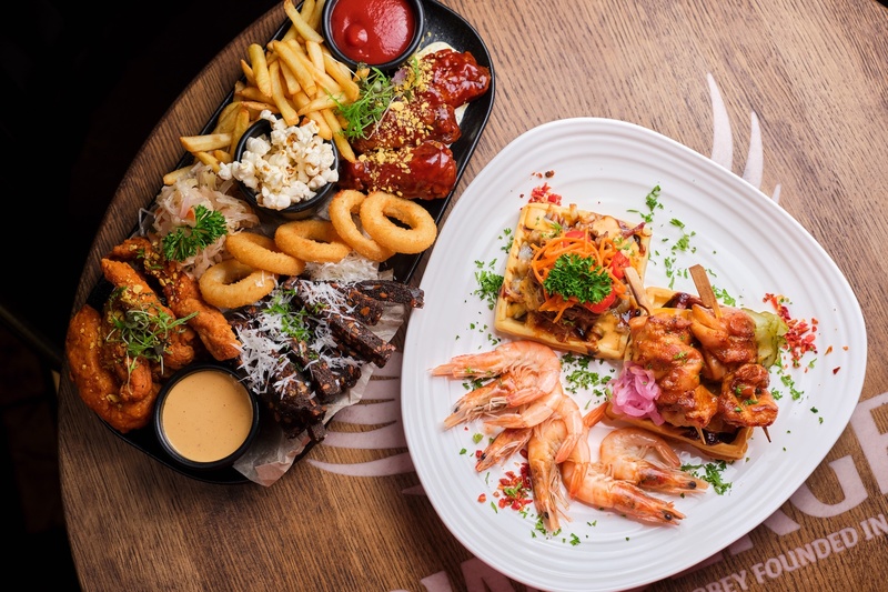 - Крафтовая вафля BBQ со smoked pulled beef, сыром моцарелла, пряной морковью и пряным майо