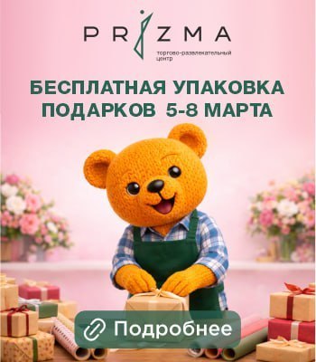 В торговом центре Prizma стартовала тематическая акция к 8 марта. При покупке подарков стоимостью от 100 рублей в магазинах Prizma (кроме сети «Гиппо») можно получить для них бесплатную упаковку на первом уровне центра.